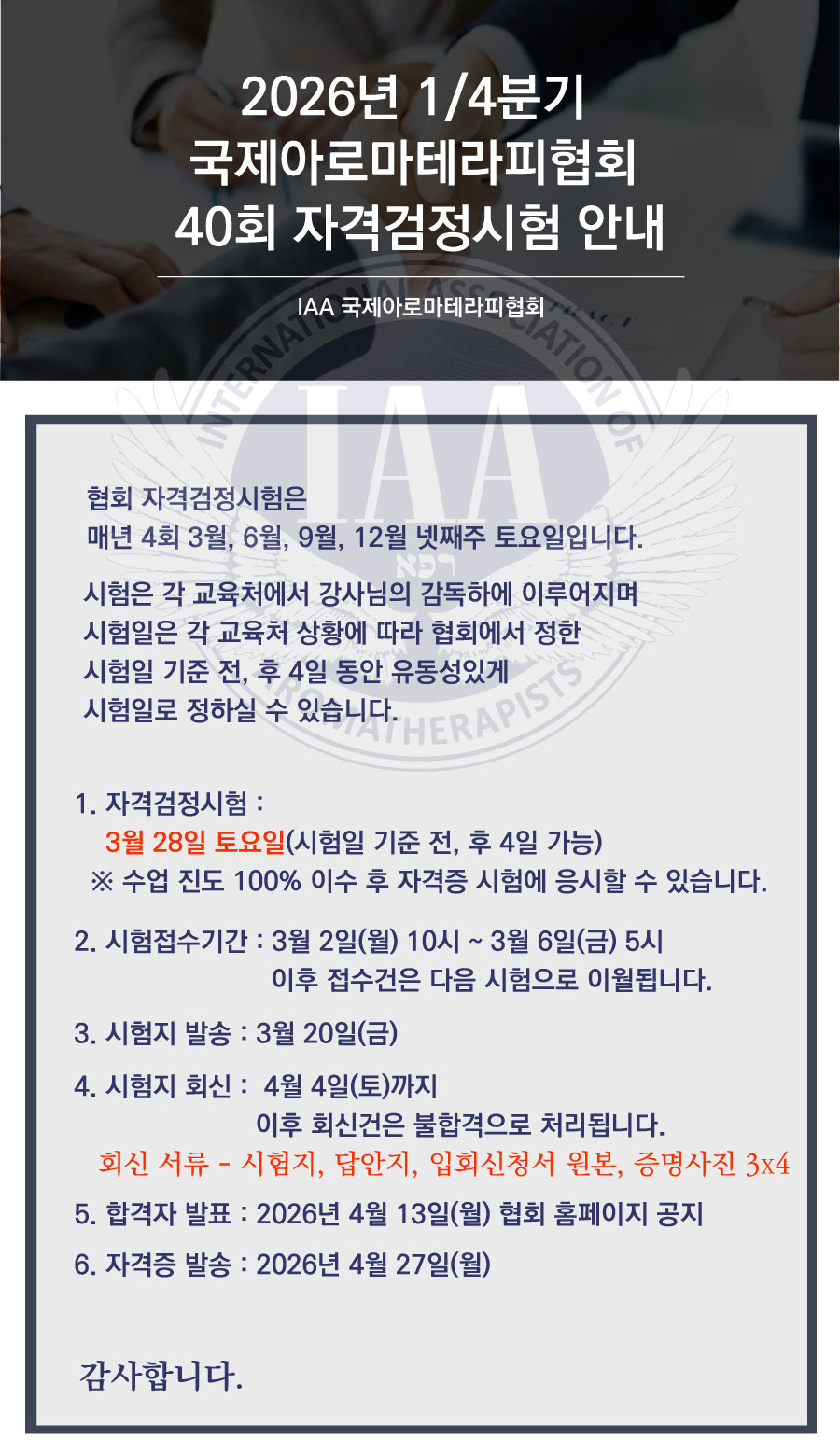 [정기시험] 2026년 1/4분기 40회 자격검정시험안내 - 22기 아로마조향사 시험 / 국제아로마테라피협회