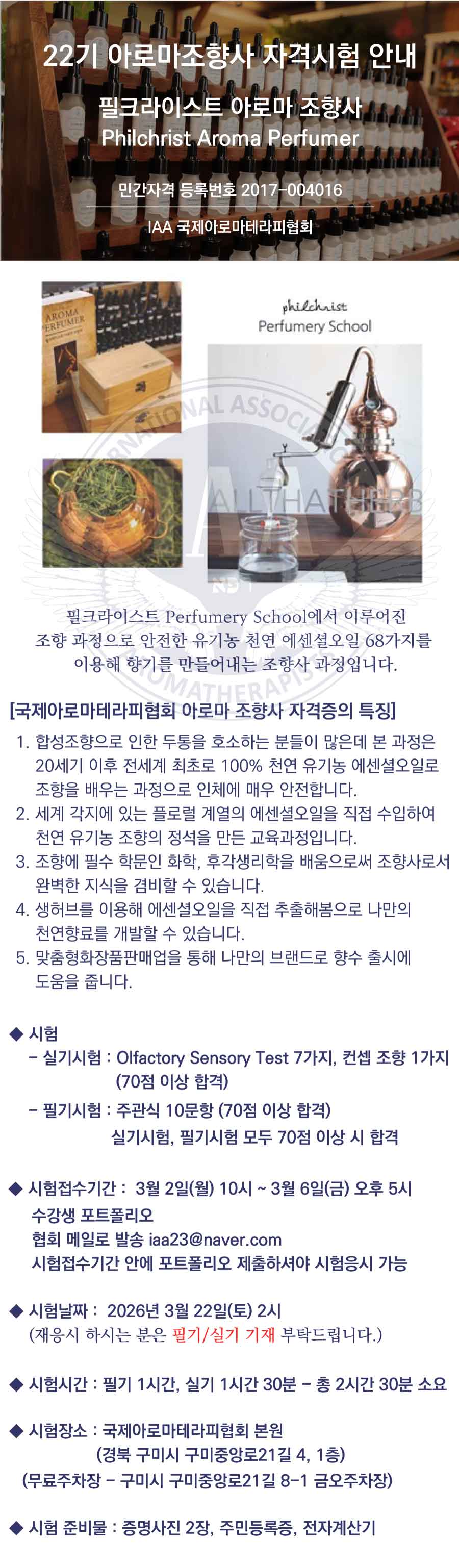 [정기시험] 2026년 1/4분기 40회 자격검정시험안내 - 22기 아로마조향사 시험 / 국제아로마테라피협회